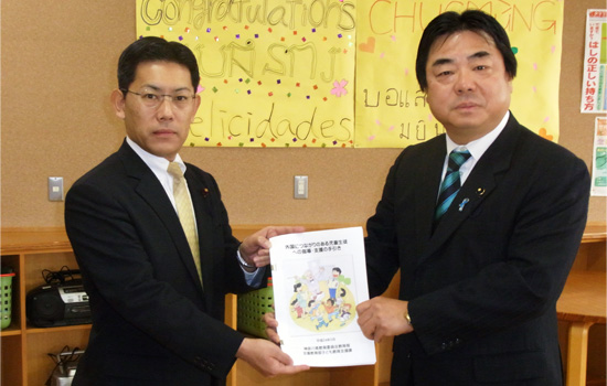 平成22年12月の代表質問において、県の教育委員会に対し、日々苦労している外国籍児童・生徒の指導にあたる国際教室担当の先生方に、より一層の支援をすべき、と提案した。これに対し藤井教育長は「相談の多い事例や対象児童・生徒に効果的な教材例などを盛り込んだ手引書を作成し、学校での指導や市町村における研修等で活用されるよう、取り組む」との答弁があった。