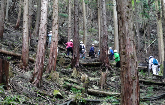 今回は5歳の男の子から80歳に近いご婦人まで、老若男女様々な方々が参加してくださったため、森の入り口から険しい場所まで体力に応じた間伐を約3時間にわたって行い、5本の間伐を完了し下山。全員でカレーライスを摂り、帰路に向かった。