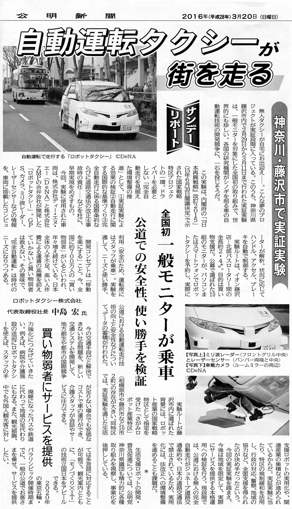 3月20日の公明新聞日曜版に先月公明党県議団として視察ををしたロボットタクシーの記事が掲載されました。 私も産業労働常任委員会で取り上げてきた案件でもあり一日も早い実現を願う一人です。 しかし現実には法規制やAIとハードと連携等、まだまだ越えばければればならないハードルが高いと思います。 googleの自動運転の試験車が事故を起こしたニュースも考えさせられるものがあります。 これからも実現に向け政策提言をしっかり続けて参ります!