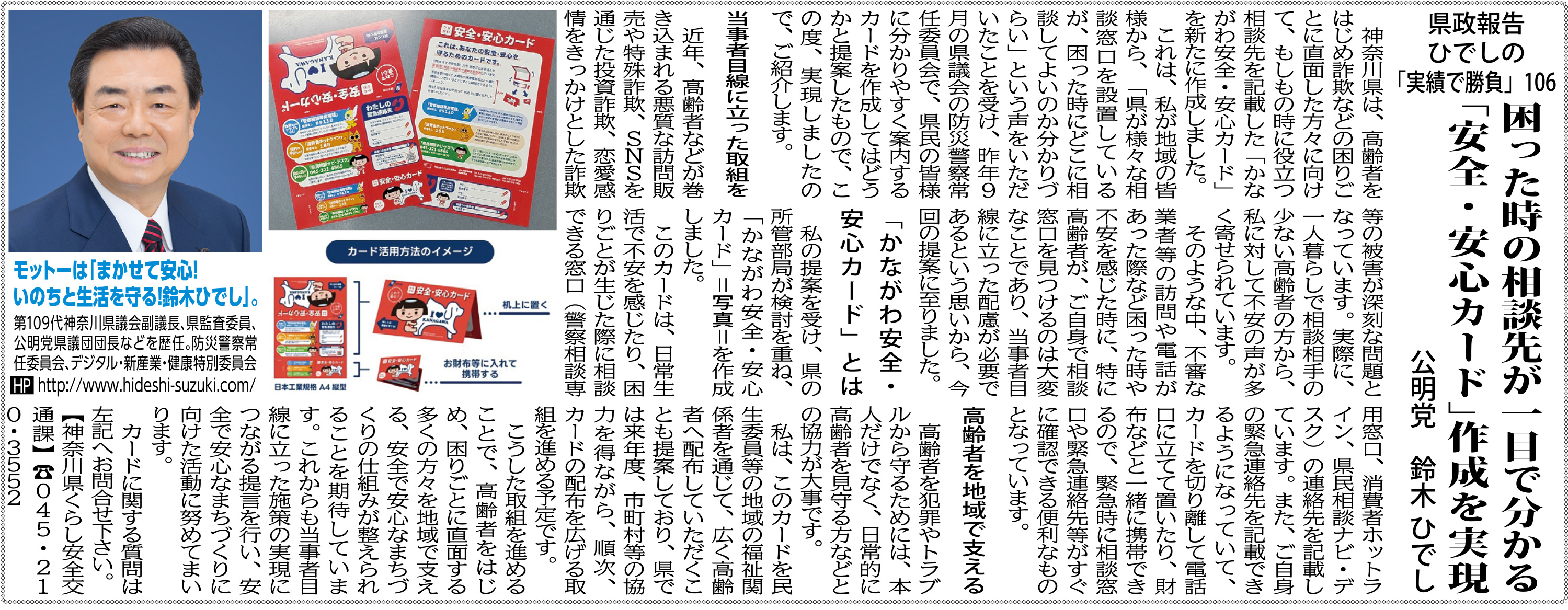 【県政報告】ひでしの「実績で勝負」106 困った時の相談先が一目で分かる「安全・安心カード」作成を実現